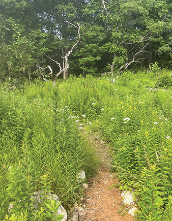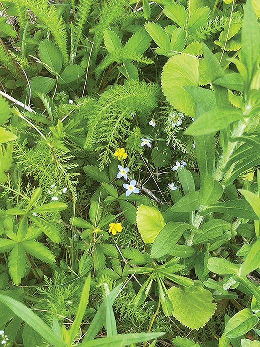 Barely two years on this improvised landscape is a profusion of flowers, foliar textures, and the attendant buzz of insects that can be seen, heard, and felt. Staghorn sumac (Rhus typhina) immediately filled the void left by the invasive shrubs and lianas, and seed-lings of black cherry and red oak are emergent everywhere amidst the herbaceous material.