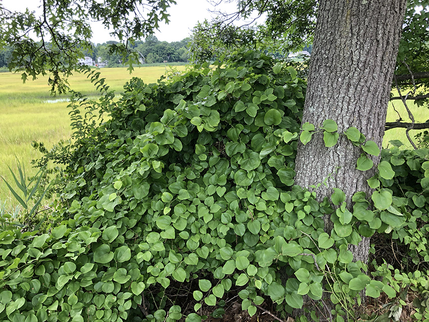 By Will RowlandsWe have a new problem plant in Fairfield but we can’t call it invasive because it’s a native! The culprit is Smilax rotundifolia, commonly known as roundleaf greenbrier or common greenbrier. Arthur Haines in Flora Novae Angliae says it’s found all over New England, except Vermont. It grows in dry-mesic or mesic forests, woodlands, fields and pond borders. It’s also found along the moist edges of swampy woods, in Christmas tree plantations and orchards. It may be a native but Teri Dunn Chace includes it her book, How to Eradicate Invasive Plants. It’s also included in Weeds of the Northeast by Richard Uva et al. “Its pliable green…